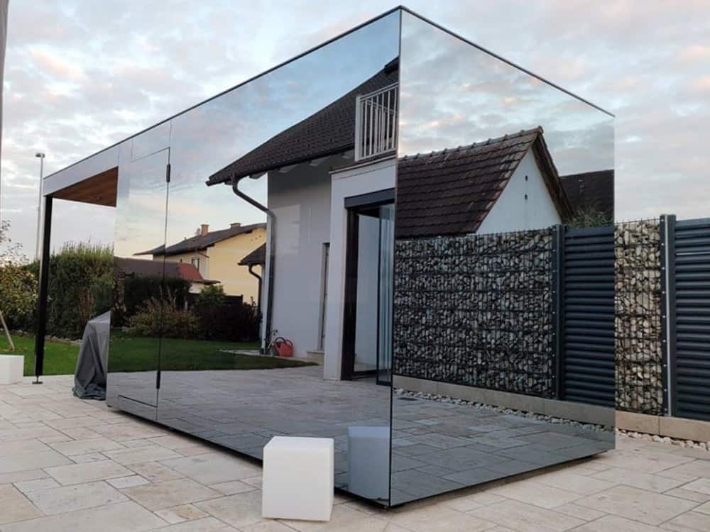 Mirrored glass also offers other advantages: it reflects the green of the surroundings and blends the cabin harmoniously and almost invisibly into the overall ambience of the garden. It also prevents a direct view of the interior of the sauna during the day, and even at night when the light is dim, the view of the interior is greatly reduced and allows for relaxed sauna use.