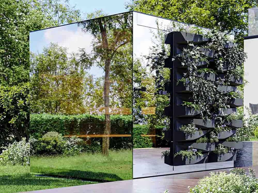 Mirrored glass also offers other advantages: it reflects the green of the surroundings and blends the cabin harmoniously and almost invisibly into the overall ambience of the garden. It also prevents a direct view of the interior of the sauna during the day, and even at night when the light is dim, the view of the interior is greatly reduced and allows for relaxed sauna use.