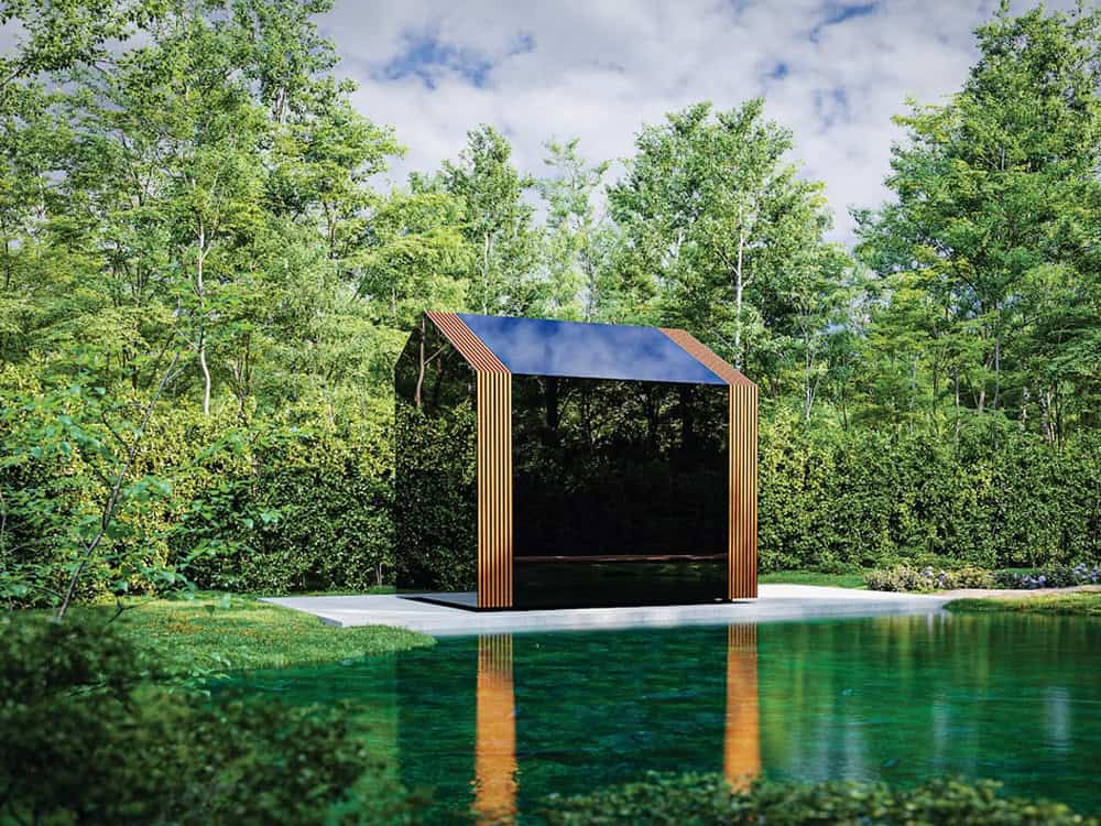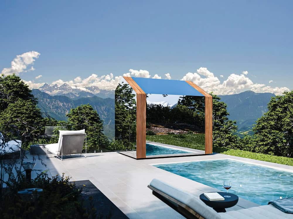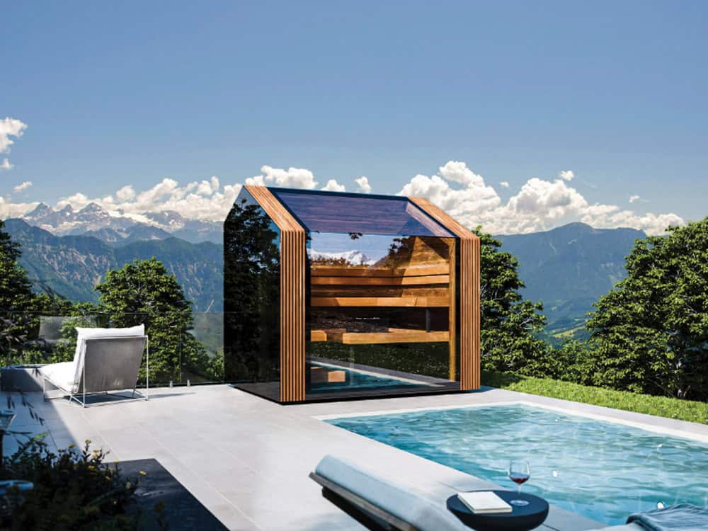 Its distinctive asymmetrical roofline defines the exterior character while playing an important functional role inside. The shape naturally guides warm air toward the seating area and enables the integration of a generous skylight, creating a bright yet intimate atmosphere. The specially selected dark grey glass ensures privacy during the sauna session, allowing clear outward views while shielding the interior from outside visibility.