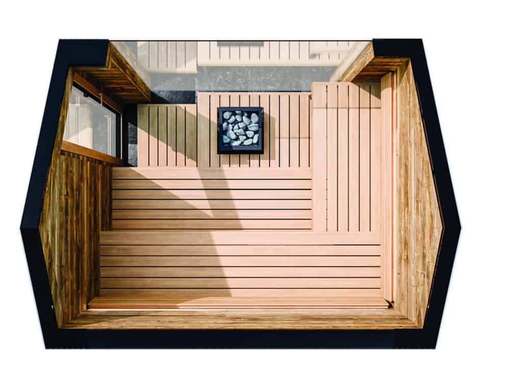 The intelligently arranged benches provide comfortable seating within a compact footprint, maintaining ergonomic support and a balanced heat experience. A practical leg rest placed in front of the benches adds an extra layer of comfort.